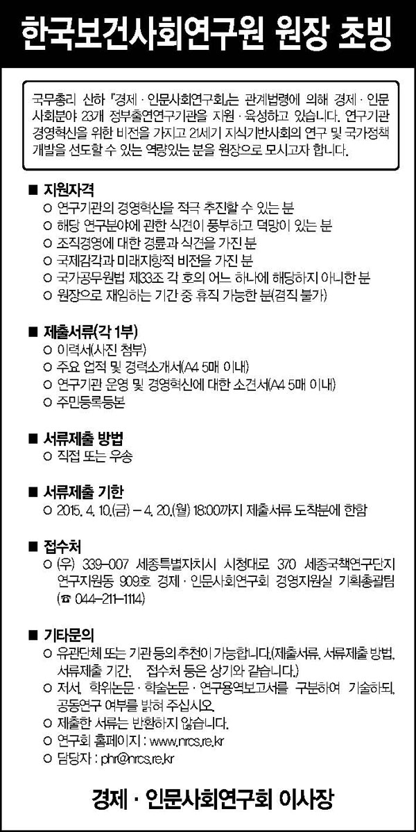 [경제·인문사회연구회] 한국보건사회연구원 원장 초빙공고