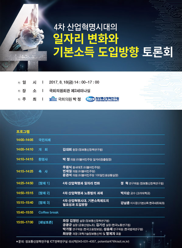 ■ 행사명 : 4차 산업혁명시대의 일자리 변화와 기본소득 도입방향 토론회■ 일 시 : 2017. 8. 18(금) 14:00 ~ 17:00■ 장 소 : 국회의원회관 제2세미나실■ 주 최 : 국회의원 박정, 정보통신정책연구원■ 온오프믹스 사전등록 바로가기 : https://onoffmix.com/event/109013