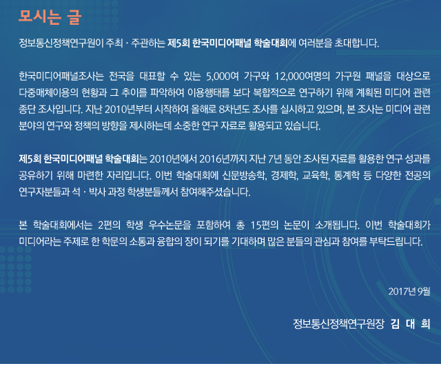 ■ 행사명 : 제5회 한국미디어패널 학술대회■ 일시 : 2017.9.8(금) 12:30 ~ 16:50■ 장소 : 양재동 스포타임 5층 멜론홀, 오렌지홀, 애플홀, 체리홀■ 주최/주관 : 정보통신정책연구원■ 행사 사전등록 페이지 : https://onoffmix.com/event/111211