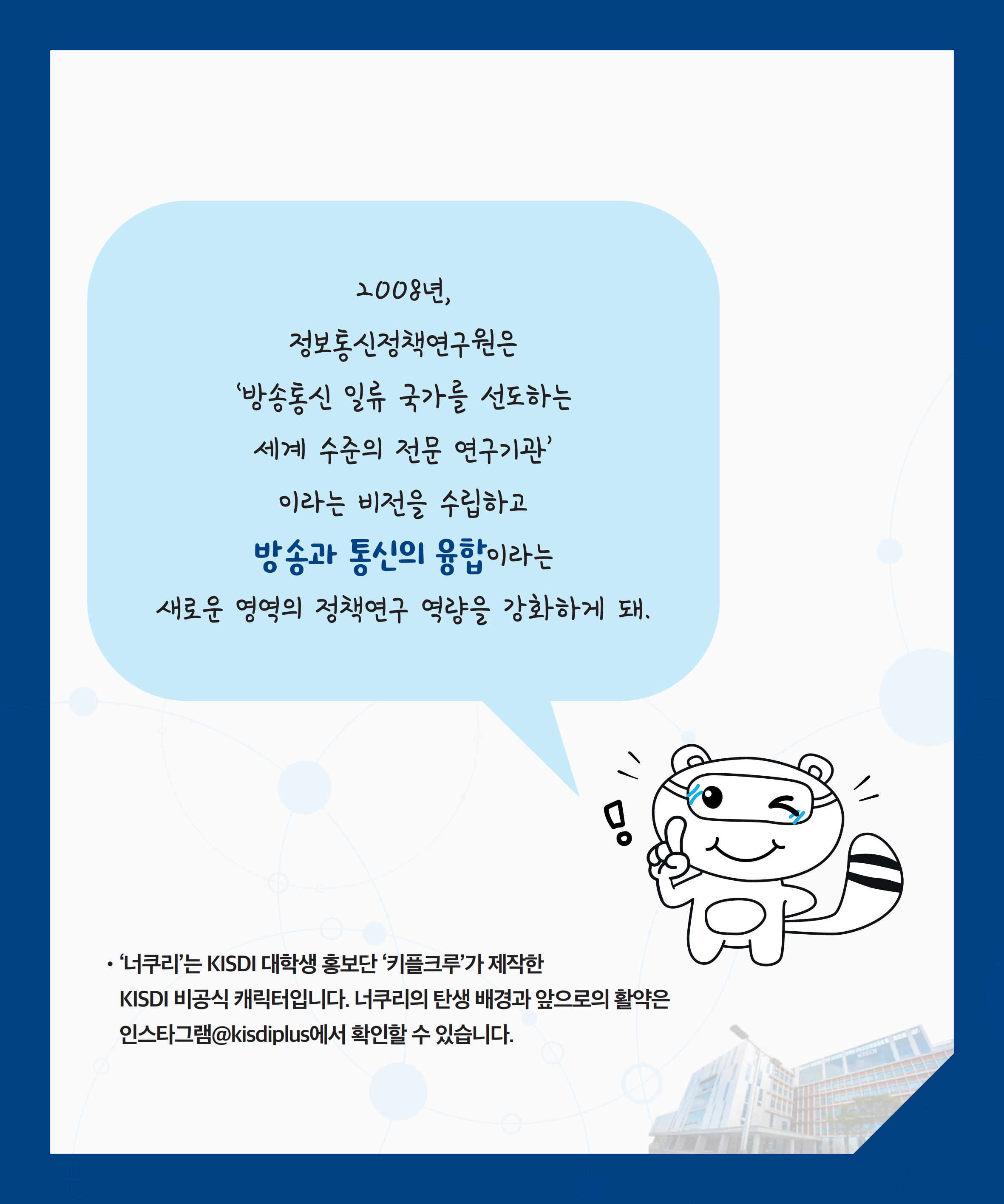 ‘너구리’는 KISDI 대학생 홍보단 ‘키플루’가 제작한 KISDI 비공식 캐릭터입니다.