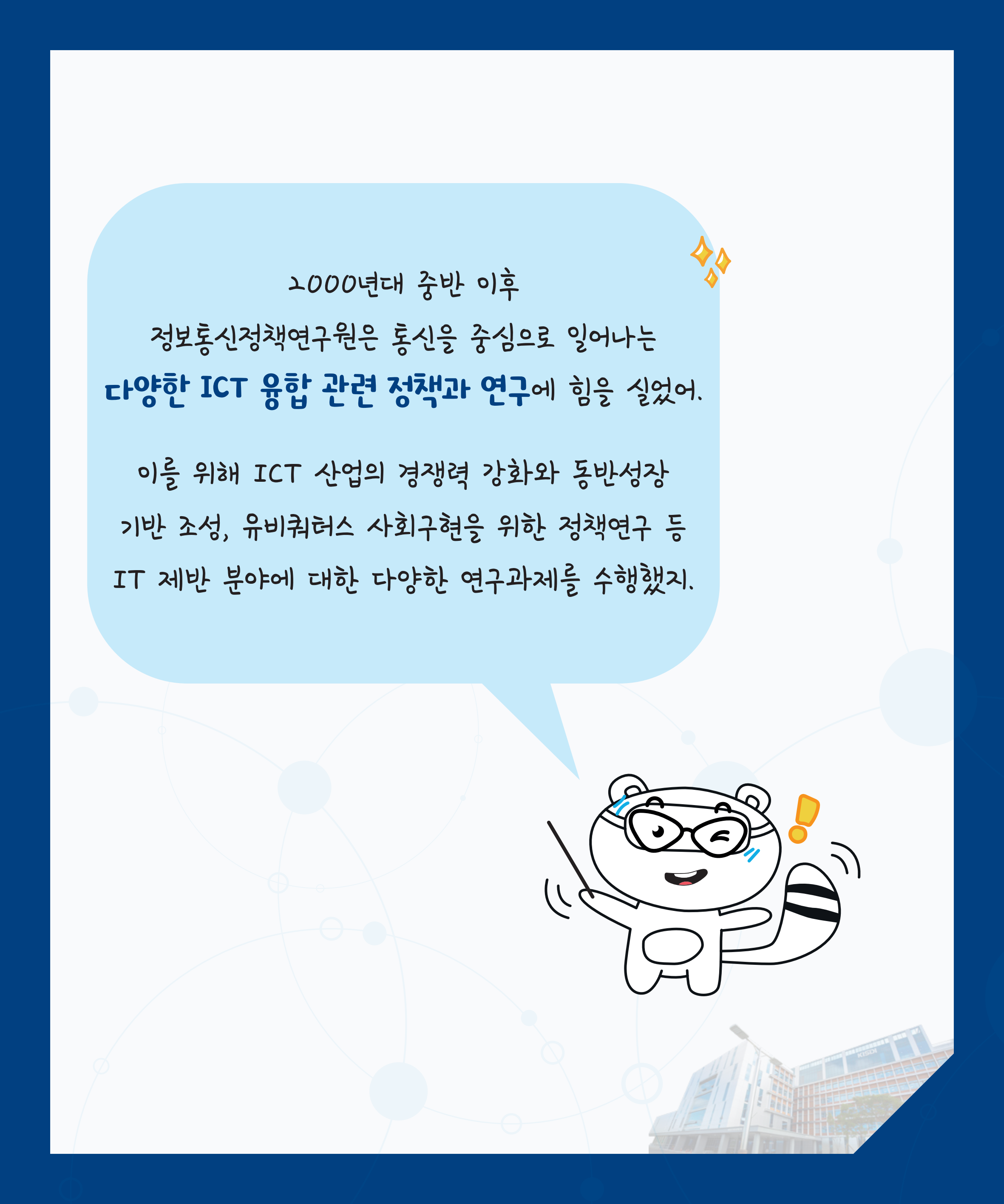 정보통신정책연구원의 많은 연구가 ICT 발전의 기반이 되었지.