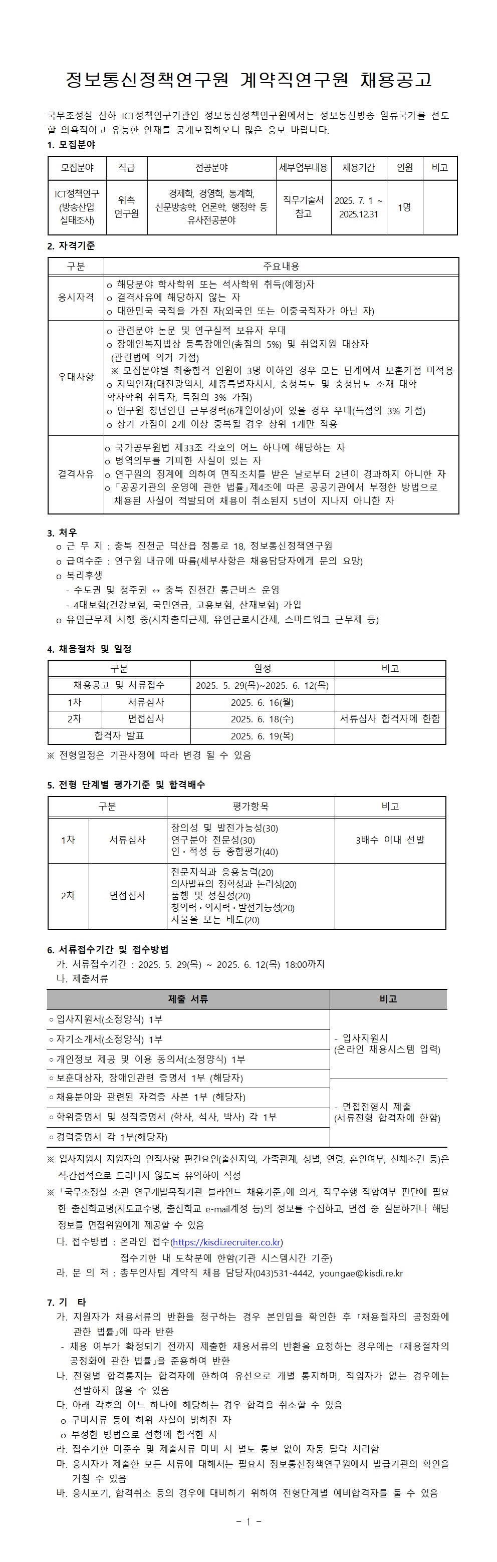 정보통신정책연구원 계약직연구원(방송산업 실태조사) 채용공고