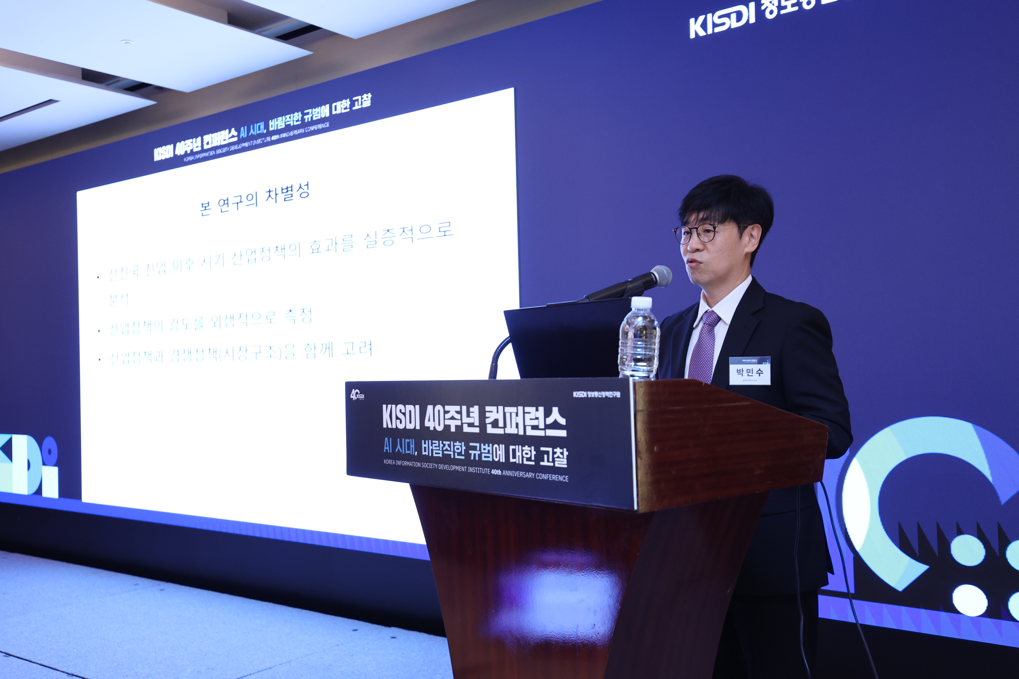 박민수 성균관대학교 교수는 ‘아시아 금융위기 이후 한국 ICT 산업정책 효과’를 주제로 아시아 금융위기 이후 ICT 산업에 대한 정책금융의 효과를 분석하였다. 분석 결과에 따르면 한국의 아시아 금융위기 이후 정책금융은 ICT 산업 전반의 투자나 생산성 향상에는 유의미한 효과가 없었으며, 오히려 시장집중도가 높은 산업에서만 제한적으로 정책효과가 나타난 것으로 나타났다. 이 결과를 바탕으로, 새로운 성장주도 산업으로 주목받는 AI 분야에 대규모 정부투자를 추진함에 있어 단발적 금융지원이나 세제혜택에 그칠 것이 아니라, 산업별 경쟁 환경과 구조적 특성을 반영한 실효성 있는 정책설계가 필요하다고 강조하였다.