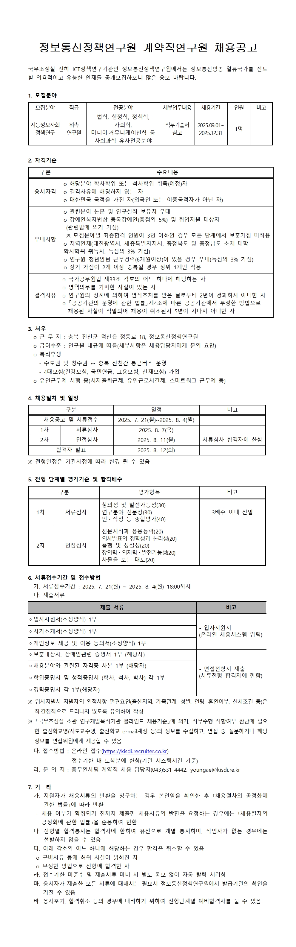 접수방법 : 온라인 접수(https://kisdi.recruiter.co.kr) 접수기한 내 도착분에 한함(기관 시스템시간 기준)