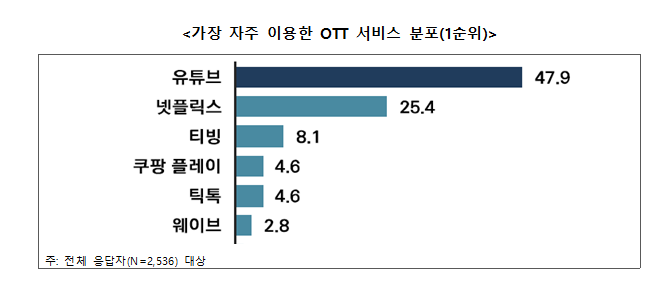 ▲ 가장 자주 이용하는 OTT 서비스는 유튜브(47.9%), 넷플릭스(25.4%), 티빙(8.1%) 순