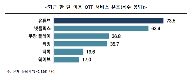 ▲ OTT 서비스 중 ‘유튜브’ 이용률이 73.5%로 가장 높아