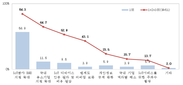 국내 IoT의 성장과 발전을 위한 정책적 요구에 대해 전문가 델파이 조사 결과, R&D지원 확대(84.3%), 국내 중소기업 지원 확대(64.7%), IoT디바이스 인증절차 및 비용절감(52.9%) 순으로 조사되었다.