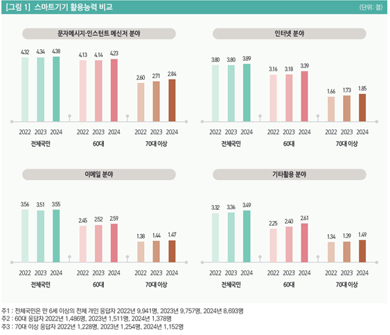 한편, 70대 이상은 전 분야에 걸쳐 소폭의 상승 추세를 보이고는 있으나, ‘문자메시지·인스턴트 메신저’ 분야를 제외하고는 활용 능력이 1점대에 머물러 60대와 뚜렷한 격차를 보였고, 특히 ‘인터넷 분야’에서 가장 큰 격차(2024년 기준 1.54점)가 나타났다.