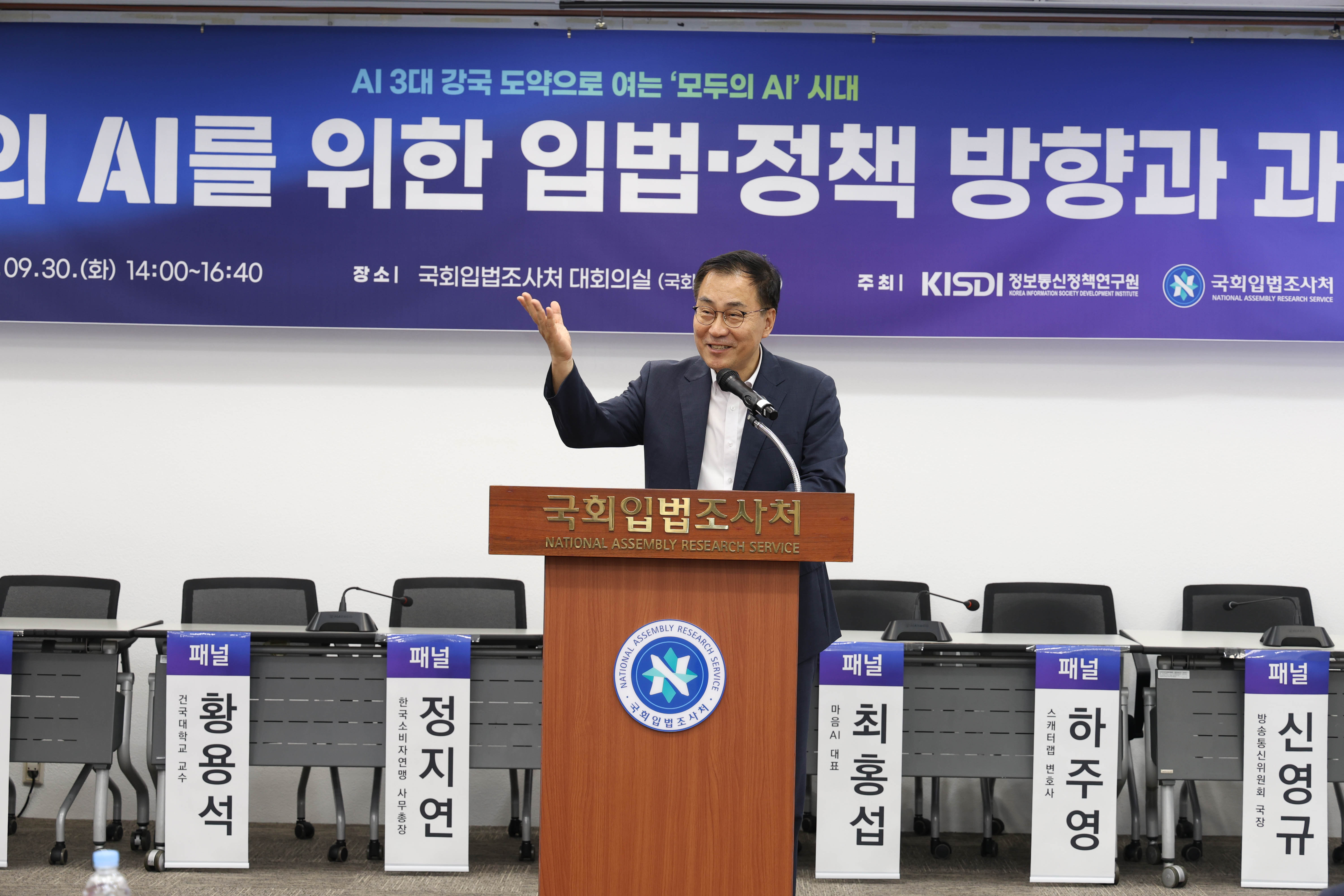 정보통신정책연구원(KISDI, 원장 이상규)과 국회입법조사처(처장 이관후)는 9월 30일(화) 오후 2시, 국회입법조사처 대회의실에서 「모두의 AI를 위한 입법·정책 방향과 과제」 세미나를 공동 개최했다.