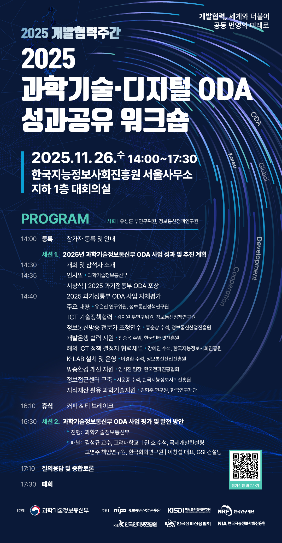 2025 개발협력주간 2025 과학기술·디지털 ODA 성과공유 워크숍 개발협력, 세계와 더불어 공동 번영의 미래로 2025.11.26. 수 14:00~17:30 한국지능정보사회진흥원 서울사무소 지하 1층 대회의실 PROGRAM 14:00 등록 참가자 등록 및 안내 세션 1. 2025년 과학기술정보통신부 ODA 사업 성과 및 추진 계획 14:30 개회 및 참석자 소개 14:35 인사말 과학기술정보통신부 시상식 2025 과기정통부 ODA 포상 14:40 2025 과기정통부 ODA 사업 자체평가 주요 내용 유준선 연구위원, 정보통신정책연구원 ICT 기술정책협력 김지원 부연구위원, 정보통신정책연구원 정보통신방송 전문가 초청연수 홍순상 수석, 정보통신산업진흥원 개발은행 협력 지원 전승욱 주임, 한국인터넷진흥원 해외 ICT 정책 결정자 협력채널 강혜진 수석, 한국지능정보사회진흥원 K-LAB 설치 및 운영 이경환 수석, 정보통신산업진흥원 방송환경 개선 지원 임석진 팀장, 한국전파진흥협회 정보접근센터 구축 지윤호 수석, 한국지능정보사회진흥원 지식재산 활용 과학기술지원 김형주 연구원, 한국연구재단 16:10 휴식 커피 & 티 브레이크 16:30 세션 2. 과학기술정보통신부 ODA 사업 평가 및 발전 방안 진행 과학기술정보통신부 패널 김성규 교수, 고려대학교 권 호 수석, 국제개발컨설팅 고영주 책임연구원, 한국과학연구원 이창섭 대표, GSI 컨설팅 17:10 질의응답 및 종합토론 17:30 폐회 참가신청 바로가기 주최 과학기술정보통신부 주관 nipa 정보통신산업진흥원 KISDI 정보통신정책연구원 NRF 한국연구재단 KISA 한국인터넷진흥원 RAPA 한국전파진흥협회 NIA 한국지능정보사회진흥원