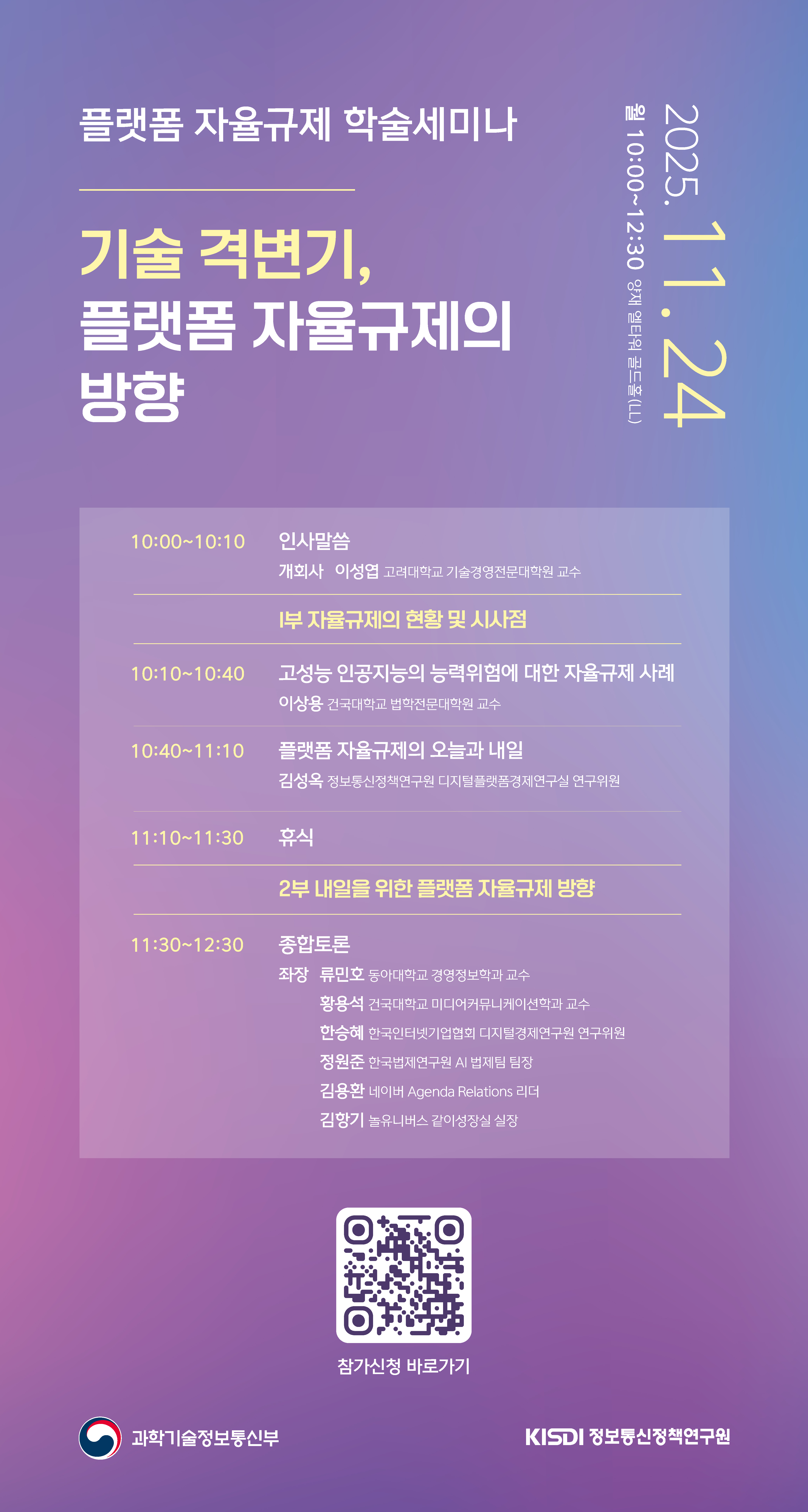 플랫폼 자율규제 학술세미나 기술 격변기, 플랫폼 자율규제의 방향 2025.11.24 월 10:00~12:30 서울 웨딩타워 콘도룸(11F) 10:00~10:10 인사말씀 개회사 이성엽 고려대학교 기술경영전문대학원 교수 1부 자율규제의 현황 및 시사점 10:10~10:40 고성능 인공지능의 능력위험에 대한 자율규제 사례 이상용 건국대학교 법학전문대학원 교수 10:40~11:10 플랫폼 자율규제의 오늘과 내일 김성욱 정보통신정책연구원 디지털플랫폼경제연구실 연구위원 11:10~11:30 휴식 2부 내일을 위한 플랫폼 자율규제 방향 11:30~12:30 종합토론 좌장 류민호 동아대학교 경영정보학과 교수 황용석 건국대학교 미디어커뮤니케이션학과 교수 한승희 한국인터넷기업협회 디지털경제연구원 연구위원 정원준 한국법제연구원 AI 법제팀 팀장 김용환 네이버 Agenda Relations 리더 김광기 놀유니버스 같이성장실 실장 참가신청 바로가기 QR코드 과학기술정보통신부 KISDI 정보통신정책연구원