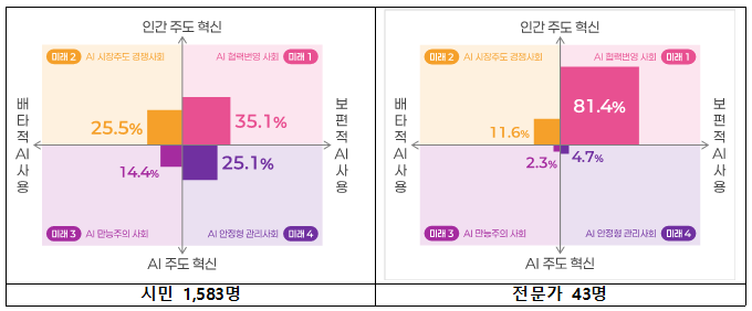 또한, 이번 연구에서는 시민과 전문가가 참여한 미래 시나리오 분석을 통해 현재 우리 사회가 ‘시장 주도 경쟁사회’의 경로에 놓여있음을 진단하고, 이를 넘어 ‘AI 협력번영 사회’로 나아가기 위한 새로운 제도적 비전을 제시했다. ‘혁신의 주체’와 ‘자원의 배분 방식’을 핵심 축으로 2035년 미래상을 ▲AI 협력번영 사회(보편적 AI 사용, 인간 주도 혁신), ▲AI 시장주도 경쟁사회(배타적 AI 사용, 인간 주도 혁신), ▲AI 만능주의 사회(배타적 AI 사용, AI 주도 혁신), ▲AI 관리형 안정사회(국가 주도 관리, AI 주도 혁신) 등 4가지 시나리오로 도출했다.