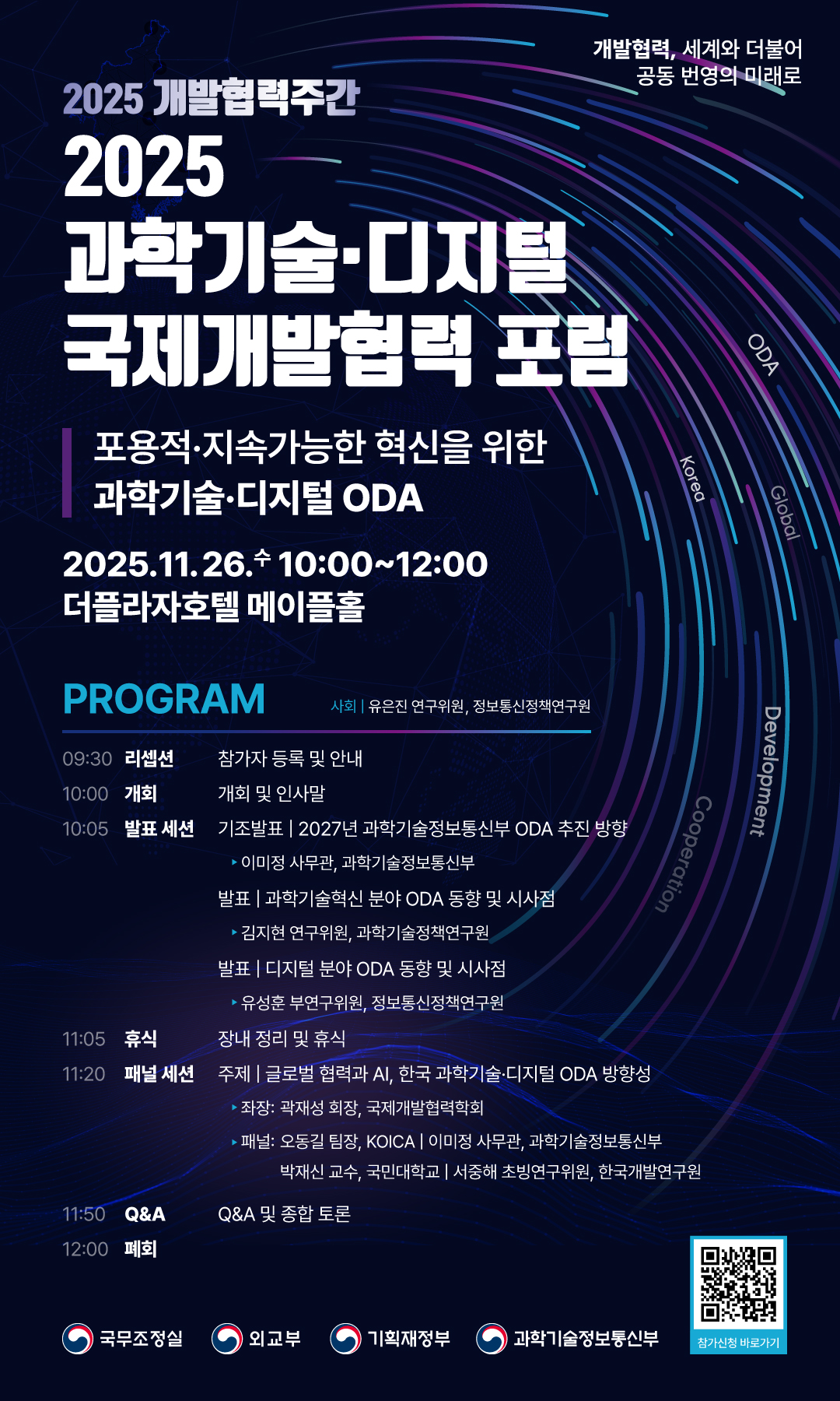 발표 세션에서는 과학기술정보통신부 이미정 사무관이 ‘2027년 과학기술정보통신부 ODA 추진 계획’을 발표하며, 실용주의 외교 정신에 발맞춘 과학기술·디지털 ODA 사업 내용을 소개한다. 이어 과학기술정책연구원(STEPI) 김지현 연구위원이 ‘과학기술혁신 분야 ODA 동향 및 시사점’을 발표하며, 주요 공여국 사례 분석과 함께 연구-정책-산업 연계를 통한 협력 전략 전환 필요성을 한다. 정보통신정책연구원(KISDI) 유성훈 부연구위원은 디지털 및 AI 기반 협력 전략 확대를 주제로 ‘디지털 분야 ODA 동향 및 시사점: AI 시대 국제개발협력 주요 이슈와 대응 방안’을 발표하며, AI 기반 정책 설계 정밀화, 공공서비스 혁신, 디지털 격차 및 알고리즘 편향 대응 방안을 제시할 예정이다.