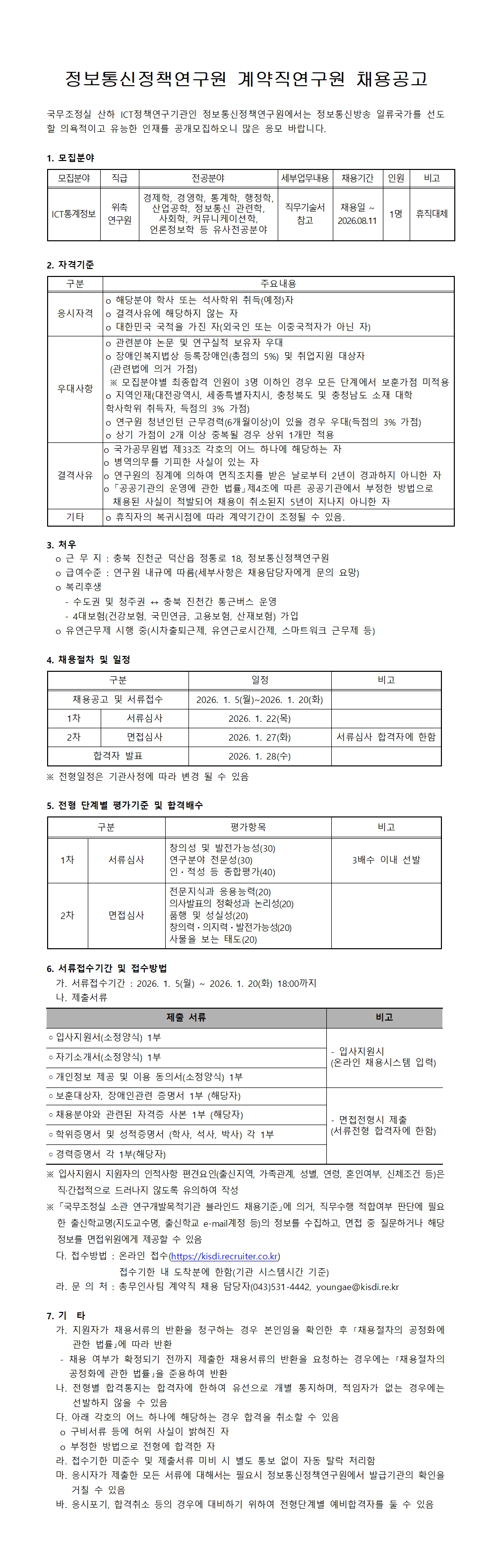 정보통신정책연구원 계약직연구원(ICT통계정보) 채용공고