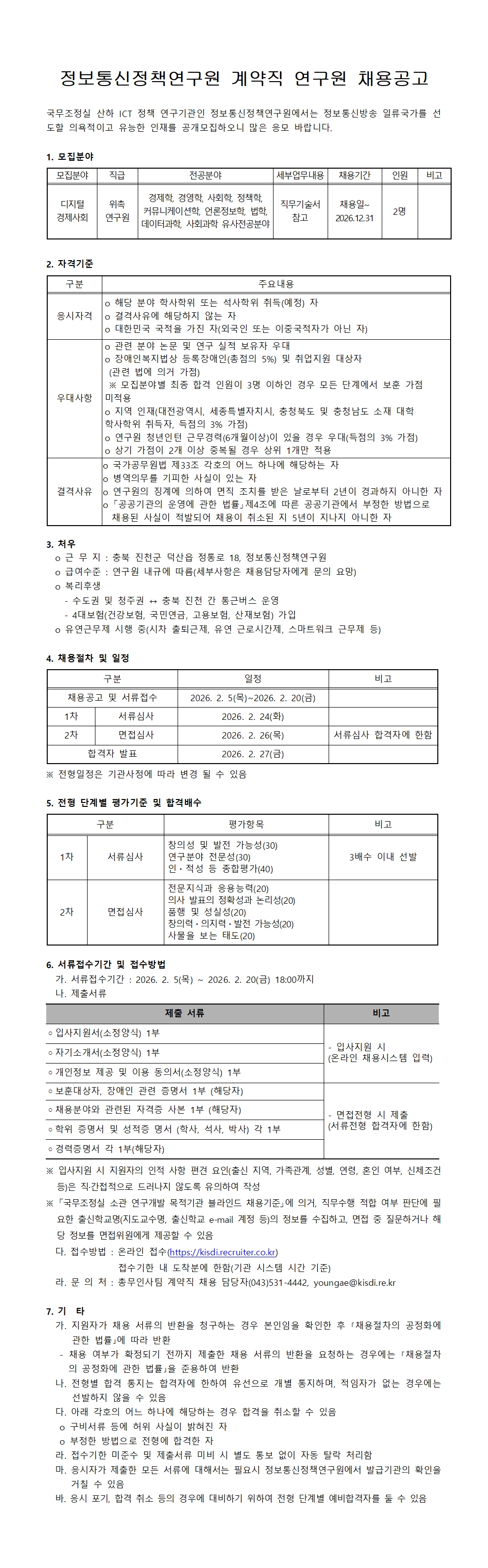 정보통신정책연구원 계약직 연구원(디지털경제사회) 채용공고