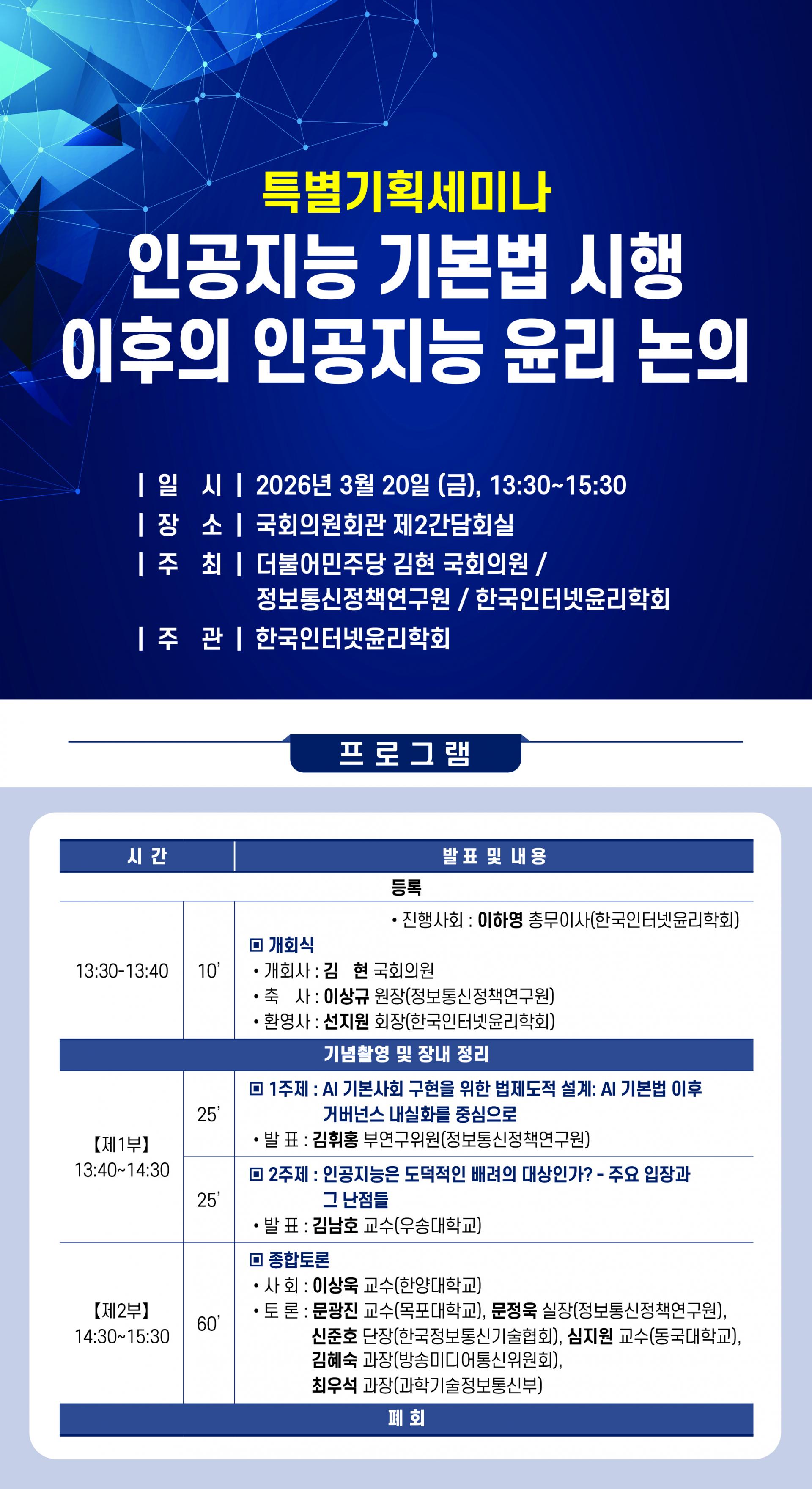 ‘인공지능 기본법 시행 이후의 인공지능 윤리 논의’를 주제로 한 세미나가 2026년 3월 20일 국회의원회관에서 개최되었다.