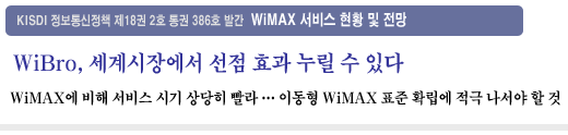 이는 WiMAX와 경쟁관계에 있고 서비스 상용화를 눈앞에 두고 있는 우리나라의 WiBro가 상당한 시장 선점 효과를 누릴 수 있음을 의미하며, WiBro 표준이 모바일 WiMAX 표준에 요소별로 반영돼 일정 정도 호환성을 갖춘 상황을 고려할 때, 상당한 경쟁우위를 점할 가능성을 보여주는 것이라 할 수 있다.