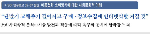 정보통신정책연구원(원장 이주헌) 디지털미래연구실 최항섭 연구위원, 김희연 연구원은 KISDI 연구보고 05-07 ‘이동전화 소비양식에 대한 사회문화적 이해’ 보고서에서 이동전화의 소비트렌드로 ▲이동전화의 소비 양극화 ▲이동전화의 외양적 기능 강화 ▲빠른 교체의 소비 ▲온라인 네트워크를 통한 소비정보의 수집 등을 제시하였다.