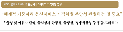 가격차별의 개념과 이론 그리고 통신서비스와 관련된 법규, 판례, 해외사례 등을 토대로 통신서비스시장에서의 가격차별의 부당성을 판별하기 위한 보다 체계적인 기준을 마련할 필요가 있다.