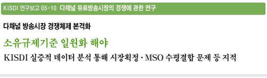 정보통신정책연구원(원장 이주헌) 통신방송연구실 이상우 연구위원은 KISDI 연구보고 05-10 ‘다채널 유료방송시장의 경쟁에 관한 연구' 보고서에서 케이블TV 산업을 중심으로 다채널 유료방송의 시장구조 변화를 살피고 성과분석을 통해 다양한 서비스들의 상호 공정경쟁을 위해서는 일원화된 소유규제기준 제정이 필요하다고 주장했다.