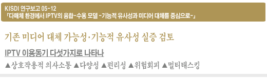 정보통신정책연구원(원장 이주헌) 통신방송연구실 이상우 연구위원은 KISDI 연구보고 05-12 ‘다매체 환경에서 IPTV의 융합-수용 모델 -기능적 유사성과 미디어 대체를 중심으로-' 보고서에서 IPTV의 선택 의도와 미디어 대체와의 관련성을 실증적으로 검증하고, 이용자들의 선택권 강화와 궁극적인 이용자의 권익을 위해 IPTV의 상용화를 서두르는 정책적 뒷받침이 필요하다고 주장했다.