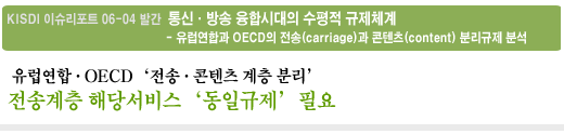 정보통신정책연구원(KISDI) 통신방송연구실 이상우 연구위원은 KISDI 이슈리포트 06-04 ‘통신방송 융합시대의 수평적 규제체계’ 보고서에서 위와 같은 문제점을 지적하면서 유럽연합과 OECD를 중심으로 논의되고 있는 전송과 콘텐츠 분리규제의 의미를 올바로 이해하고, 이를 바탕으로 국내 융합정책의 방향을 제시했다.