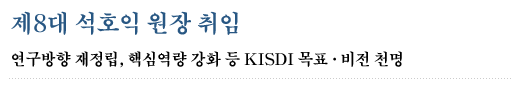 IT를 핵심축으로 우리나라가 국민소득 3만불 시대 선진국진입이라는 새로운 도약의 발걸음을 내딛고 있는 중요한 이 시기에, 우리나라의 정보통신 정책연구를 선도하는 KISDI의 제8대 원장직을 맡게 돼 개인적으로 무한한 영광과 함께 한편으로는 막중한 책임감을 느낍니다.