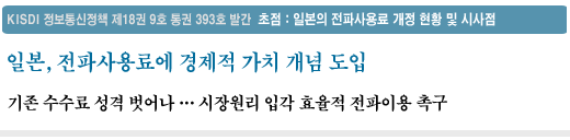 정보통신정책연구원(KISDI 원장 석호익) 통신방송연구실 임동민 연구원은 최근 ‘정보통신정책 18권 9호 초점-일본의 전파사용료제도 개정 현황 및 시사점’ 보고서에서 전파자원의 효율적 이용을 유도하기 위해 전파의 경제적 가치를 감안하고 전파관련 연구개발 재원을 충당한다는 내용을 골자로 하는 2005년 11월 일본 전파사용료제도 개선 세부현황을 분석하고, 그 의의와 관련 이슈들을 살폈다.