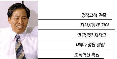 ● 경제·인문사회연구회 주관 ‘연구기관 평가’ 제고 석 원장은 임기 3년 이내 경제·인문사회연구회가 주관하는 연구기관 평가 1위 달성을 목표로 ’06년 상반기 중 지난해 평가결과 지적 사항에 대한 개선계획을 수립하고 하반기에 평가지표별 실천과제를 선정, 추진실적에 대한 상시 모니터링을 실시할 예정이다. 또한 전직원 참여의식을 확산ㆍ제고하기 위해 간부 간담회, 연찬회 등을 추진해나갈 계획이다.