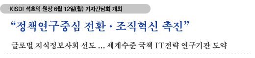 기자간담회에서 석 원장은 “국민·정부·기업 등 정책고객의 만족을 이끌어 내기위해 연구 과제와 방향을 정책연구중심으로 전환하고, 산·학·연·관 간, 학제 간 연구를 강화해 지식공동체에 기여하는 KISDI가 될 것”이라고 천명했다. 또한 “유비쿼터스 및 융합연구에 집중하도록 연구방향을 재정립하고 내부구성원 결집과 조직혁신을 촉진해 임직원들의 비전과 자긍심을 고취시키고 조직의 핵심역량(core competence)을 키워나갈 것”이라고 강조했다. 이는 KISDI를 ‘글로벌 지식정보사회를 선도하는 세계수준의 국책 IT전략 연구기관’으로 도약시키겠다는 의지의 표현이다.