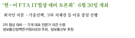 정보통신정책연구원(KISDI)은 오는 6월 30일(금, 오후 1시 30분)「한·미 FTA IT 협상 대비 토론회」를 소공동 웨스틴조선호텔에서 개최한다. 정보통신부가 후원하는 이번 토론회는 지난 한·미 FTA 1차 협상 (2006. 6. 6 - 6. 9, 워싱턴 DC)에 이은 2차 협상 (2006. 7. 10 - 7. 14)에 대비하여 IT 분야 협상 쟁점에 관한 각계 대표 및 전문가의 의견을 수렴하기 위한 자리이다.