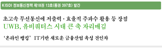 차세대 무선통신기술 가운데 하나로 UWB가 주목을 받고 있다. UWB는 초고속 무선통신과 저출력, 그리고 효율적 주파수 활용 등의 장점을 바탕으로 앞으로 유비쿼터스 시대를 구축하는 데 있어 큰 축으로 자리매김할 것으로 보인다.