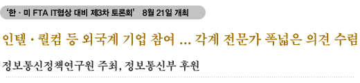 정보통신정책연구원(KISDI 원장 석호익)은 오는 8월 21일(월, 오후 1시 30분)「한·미 FTA IT협상 대비 제3차 토론회」를 대한상공회의소에서 개최한다. 정보통신부가 후원하는 이번 토론회는 지난 한·미 FTA 2차 협상 (2006. 7. 10 - 7. 14, 서울)에 이은 3차 협상 (2006. 9. 6 - 9. 9, 시애틀)에 대비해 통신서비스 분야의 협상 쟁점에 관한 각계 대표 및 전문가의 의견을 수렴하기 위한 자리이다.