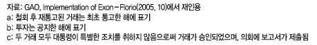 미국은 1988년 엑슨-플로리오법의 도입된 이후 1,500개 이상의 통고를 접수, 그 중 25건에 대해 검토를 착수했는데 CFIUS 검토계획이 공지되자 13건은 자체적으로 철회돼 검토대상은 12건으로 줄었고 실제 제재조치가 집행된 사례는 단 1건에 불과했다고 한다. 이는 미국기업을 인수하려던 많은 외국기업들이 CFIUS가 ‘엑슨-플로리오법’을 적용하려는 조짐만 보여도 인수시도를 철회했다는 것을 의미한다.