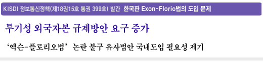 정보통신정책연구원(KISDI 원장 석호익) 정보통신협력연구실 여혁종 연구원은 22일 발간된 정보통신정책(제18권 15호) - ‘동향 : 한국판 Exon-Florio법의 도입 문제’에서 최근 한·미 FTA 협상이 진행되면서 미국이 우리나라의 기간통신사업자에 대한 외국인 지분제한 철폐를 요구할 것으로 예상됨에 따라 그에 대한 대책으로 미국의 ‘엑슨-플로리오법’과 유사한 법의 국내 도입을 요구하는 목소리가 높아지고 있다고 지적했다.