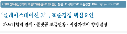 정보통신정책연구원(KISDI 원장 석호익) 정보통신산업연구실 정현준 연구원은 16일 발간된 정보통신정책(제18권17호통권401호)'에서 ‘동향 : 차세대 DVD 표준 경쟁: Blu-ray vs HD-DVD'을 통해 차세대 DVD 표준 경쟁 현황과 관련한 차세대 DVD 표준의 기술 사양 및 플레이어 출시현황, 차세대 DVD 타이틀 출시현황을 종합하여 및 표준 경쟁의 결정요인을 분석했다.