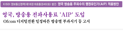 최근 영국의 Ofcom은 지상파 TV 및 라디오 방송의 용도로 쓰이는 주파수에 대한 행정적 유인가격(AIP, Administrative Incentive Pricing) 적용 계획을 발표하고, 방송별 AIP 부과시기에 관한 잠정적 결정을 고시했다.