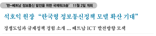 석호익 원장은 이번 행사개최와 관련 “베트남의 정보통신정책 발전방향에 대한 효과적인 방안을 모색하기 위해 한국과 베트남의 정보통신 정책관련 전문가들이 한자리에 모였다”고 배경을 설명하고 “이번 행사를 통해 ‘한국형 정보통신정책 모델의 확산'이라는 정책 플랫폼을 구축할 수 있을 것으로 기대한다”고 밝혔다. 또한 이번 행사가 “한국과 베트남 간 정보통신 협력 수준을 한 단계 업그레이드 시키는 계기가 될 것”이라고 강조했다.