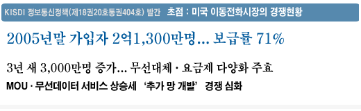 정보통신정책연구원(KISDI 원장 석호익) 통신방송정책연구실 전수연 연구원은 ‘정보통신정책(제18권20호) - 초점 : 미국 이동전화시장의 경쟁현황’에서 최근 미국 이동전화시장의 경쟁과정에서 나타난 주요 특징과 주요 성과 등을 점검했다.