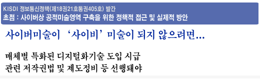 정보통신정책연구원(KISDI 원장 석호익) 미래전략연구실 정필주 연구원은 20일 발간된 정보통신정책(제18권 21호) - ‘초점 : 사이버상 공적미술영역 구축을 위한 정책적 접근 및 실제적 방안’에서 미술영역은 ‘디지털’이라는 거대한 물결을 앞두고 있으며 이에 대한 정책적 대비가 필요한 시점이라고 주장했다.