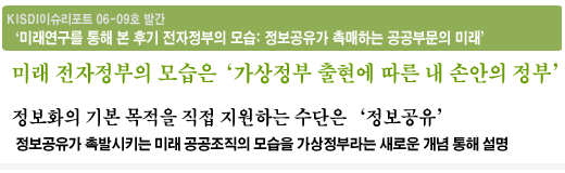 정보통신정책연구원(KISDI 원장 석호익) 미래전략연구실 정국환 실장, 문정욱 연구원, 권성미 연구원은 4일 발간한 「KISDI이슈리포트(06-09)」 ‘미래연구를 통해 본 후기 전자정부의 모습: 정보공유가 촉매하는 공공부문의 미래’에서 정보공유가 촉진하는 업무프로세스, 조직, 기능 등의 통합이 미래의 공공조직과 서비스를 어떻게 변화시킬 것인가를 살펴보고, 이에 따른 정책적 시사점들을 도출했다.