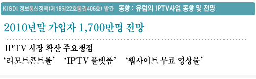 정보통신정책연구원(KISDI 원장 석호익) 미래전략연구실 김사혁 책임연구원은 6일 발간된 정보통신정책(제18권 22호) - ‘동향 : 유럽의 IPTV 사업 동향 및 전망’에서 가트너그룹(Gartner Group)의 추정치를 인용해 2005년 100만명이 되지 않았던 유럽의 IPTV 가입자수는 2006년말 약 330만명에 달할 것으로 보이며, 2007년에는 2006년의 두 배 이상, 2010년말 유럽의 IPTV 시장 규모는 약 1,700만명에 달할 것으로 전망했다.