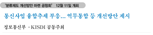 정보통신정책연구원(KISDI 원장 석호익)은 오는 12월 11일(월) 정보통신정책연구원 대강당에서 통신사업분류제도 개선방안 마련을 위한 공청회를 개최한다.