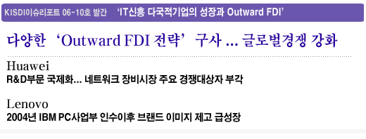 정보통신정책연구원(KISDI 원장 석호익) 정보통신산업연구실 정진한 박사, 김민식 주임연구원은 12일「KISDI이슈리포트(06-10)」‘IT신흥 다국적기업의 성장과 Outward FDI’에서 IT신흥 다국적기업들의 성장이 다양한 Outward FDI전략을 통해 이루어지고 있다고 보고하고 있다. 보고서는 IT신흥 다국적기업들 중 Huawei와 Lenovo의 성장전략 및 Outward FDI에 중점을 두어 설명하고 있으며, IT신흥 다국적 기업의 성장에 따른 IT 글로벌 시장 환경변화와 이에 대한 시사점 및 정책적 대응방안의 필요성을 제기하고 있다.