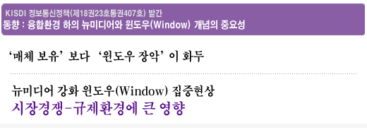 정보통신정책연구원(KISDI 원장 석호익) 공정경쟁정책연구실 곽정호 책임연구원은 19일 발간된 정보통신정책(제18권23호) - ‘동향 : 융합환경 하의 뉴미디어와 윈도우(Window) 개념의 중요성’에서 융합 환경에서는 다양한 뉴미디어가 등장하는 가운데 윈도우(Window)라는 새로운 개념이 중시되면서 ‘누가 매체를 보유하고 있느냐’보다는 ‘윈도우를 누가 장악하느냐’가 융합서비스의 시장 전반에 중요한 화두로 대두되고 있다는 논의를 분석하고, 이러한 윈도우의 강화현상은 사업자간의 시장경쟁 양상과 융합 환경에서의 규제체계에도 중요한 영향을 미칠 것으로 전망하고 있다.