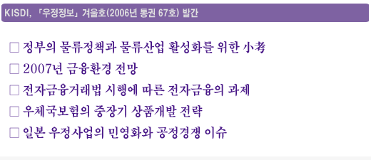 정보통신정책연구원(KISDI 원장 석호익) 우정경영연구센터는「우정정보」(2006년 겨울호)를 8일 발간했다.