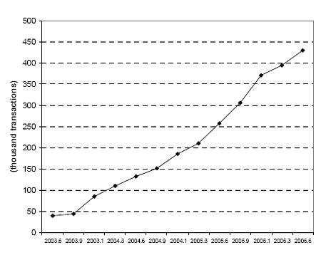 보고서에 따르면, 우리나라 모바일 뱅킹의 일별 거래 회수는 2003년 5월, 5만건 미만에서 2006년 말에는 44만6천건으로 증가한 것으로 나타났으며, 이는 2005년 말과 비교해볼 때 55.9%가 증가한 수치이다.