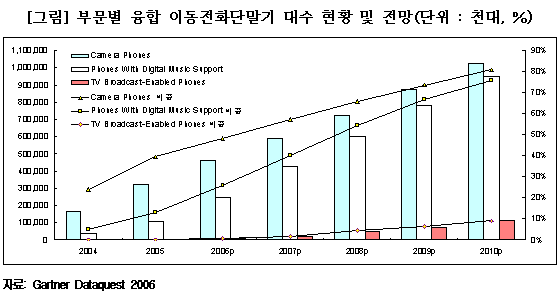 가트너(Gartner, 2006)에 의하면 ▲카메라 기능은 2006년에 50%였던 비중이 2010년에는 81% ▲디지털 음악 기능은 2006년 12%에서 2010년 76% ▲모바일 TV 기능은 2006년 0.6%에서 2010년 9%로 늘어날 전망이다.