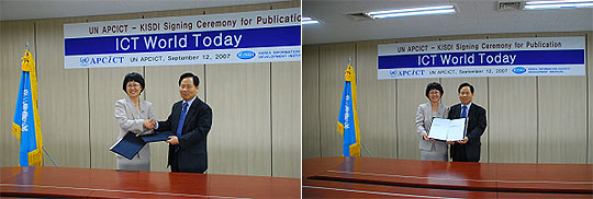 정보통신정책연구원(KISDI 원장 석호익)과 국내 최초의 UN 산하 국제기구인 아시아 태평양 정보통신교육원(UN-APCICT 원장 이현숙)은 ‘개발도상국 정보격차 해소’의 일환으로 정보통신 국제동향을 소개하는 계간지 ‘ICT World Today’를 공동발간하기로 합의하고 12일, 인천 송도국제도시에 위치한 UN-APCICT에서 협정문 체결식을 가졌다.