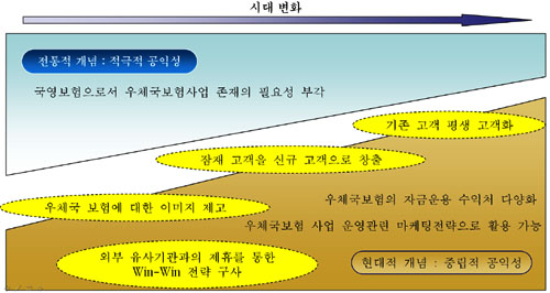 정보통신정책연구원(KISDI 원장 석호익) 우정경영연구소 박중권 책임연구원은 최근 발간된 우정정보 겨울호(2007년 통권 제 71호) ‘우체국보험의 공익사업 추진전략’에서 2006년말 현재 6.9%에 이르는 우체국보험의 생보시장 점유율을 고려해 볼 때 국영보험으로서 역할을 제고할 중요한 시기에 접어들고 있어 국영보험으로서 그동안 추구해온 여러 공익사업의 성격을 규정하고 공공성 및 수익성 측면에서 차별화된 공익사업을 추진해야할 필요성을 제시했다.